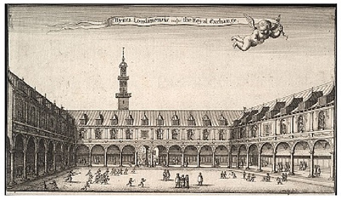It’s no surprise that Addison and Steele saw the Royal-Exchange as theatrical. The playwright Thomas Heywood found it sufficiently dramatic that he devoted an entire play to it. If You Know Not Me, You Know Nobody, Part II (published 1606) tells the story of the founding and construction of the Royal-Exchange. In Heywood’s version of the story, Sir Thomas Gresham gets caught in the rain. Aggravated that there is no covered building in which he may meet colleagues to do business, he decides to build one for the good of the city of London. The plan of the building, as described in the play, is much like the plan for an early modern theater, with a square covered area surrounding an unroofed center. (See Figs. 1 and 2) Gresham’s description of the building’s use heightens this similarity: