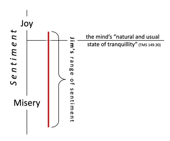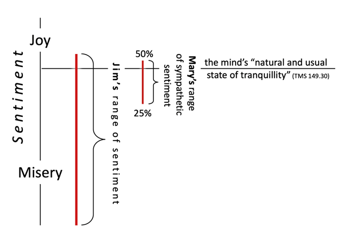 On the upside, Mary can sympathize more completely with Jim’s joy (in the figure, up to 50%) than with Jim’s suffering (only up to 25%), but in an absolute sense the sympathetic sentiment on the upside is weaker (shorter) than on the downside. Putting us in Mary’s position, Smith states this result in the title of a chapter: “though our sympathy with sorrow is generally a more lively sensation than our sympathy with joy, it commonly falls much more short of the violence of what is naturally felt by the person principally concerned [Jim]” (43). Upside sympathy is more complete, and yet smaller, than downside sympathy.