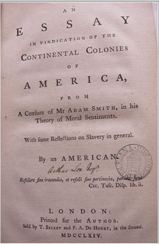 Anonymous. 1764. An Essay in Vindication of the Continental Colonies of America, from A Censure of Mr Adam Smith, in his Theory of Moral Sentiments. With some Reflections on Slavery in General. London: Sold by T. Becket and P. A. De Hondt. [This pamphlet has been attributed to Arthur Lee—erroneously, we believe.]