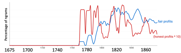 Likewise, “fair profits” and “honest profits” prove that McCloskey is right: Around 1770 some people started to talk of “fair profits” and “honest profits.” Profits could be fair and honest—who knew?!