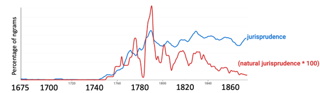 But after 1740, with Latin waning, usage of the word jurisprudence rose steadily to about 1790, as the following figure shows.