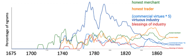 The striking thing about the figure is the flatline from 1675 to about 1740 for most of the ngrams shown. “Virtuous industry” was zilch—zilch!—from 1675 to 1736, and then some people started writing “virtuous industry.” Virtue + industry, what a notion!