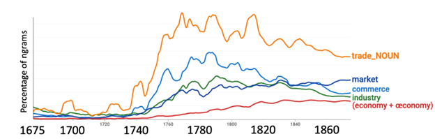 Stewart wrote that it is also to jurisprudence that “we are chiefly indebted for the modern science of Political Economy” (p. 171). The very concepts of ‘the free market’ and ‘intervention’ are rooted in the formulations of commutative justice: not messing with other people’s stuff. Jurisprudence was critical to the development of economic thought. The figure below indicates a sharp rise in economic discourse in the 1740s and 1750s.