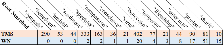 1 HTML copies of WN and TMS on the liberty fund website were searched for the word counts. Search results for TMS include results from the Essay on Languages. The root searched column shows the text searched for. Searching for the roots helped capture different variations of a word in a single search, such as sympathy and sympathize from “sympath”. The TMS and WN column exclude any results from the editor’s introduction or the editor's footnotes. ‘Virtually’ was excluded from search results coming from “virtu,” and ‘jurisprudence’ was removed from “pruden”. The Excel file is here.