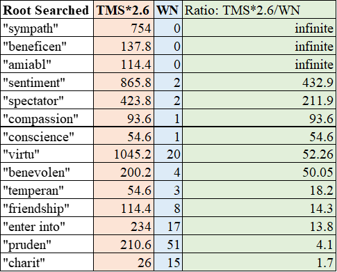 The only word in Table 1 used more often in WN than in TMS is charity. But WN is much longer than TMS. To adjust for length, we multiply the term frequencies for TMS by 2.6, as WN is 950 pages in the modern Glasgow edition (OUP/Liberty Fund), and TMS is 366 pages (we include the Language essay as part of TMS), and 950/366 is approximately 2.6. The rightmost column in Table 2 shows the ratio, adjusted for length.