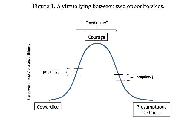 In Part 1 we discussed propriety as the “OK” region between praiseworthiness and blameworthiness. The notion of propriety is used on both of two sides of a virtue: the deficiency side and the excess side. Smith embraces Aristotle’s picture of Deficiency-Virtue-Excess. Thus we have Vice-Virtue-Vice.
