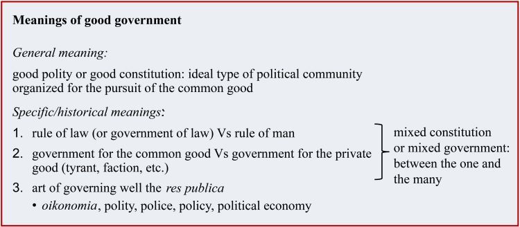 In the above outline we have summarized both the various meanings of good government in the Western tradition and Smith’s twofold masterstroke. On the one hand, he rediscovers and renews the ancient ideal of good government as a mixed constitution, which he conceives as capable of holding together the first two specific meanings of good government. On the other hand, he profoundly, and irrevocably, alters the third specific meaning of good government through his reflection on Political economy as a (new) “science of Legislator”.