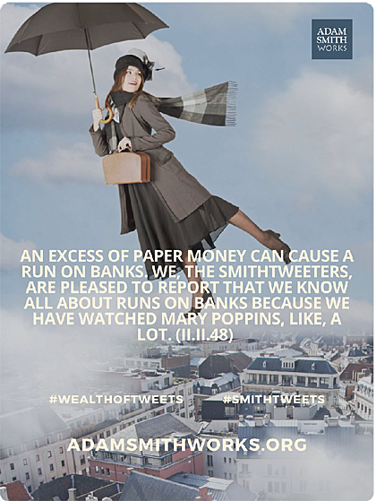 An excess of paper money can cause a run on banks. We, the SmithTweeters, are pleased to report that we know all about runs on banks because we have watched Mary Poppins, like, a lot. (II.ii.48)https://www.youtube.com/embed/xE5klz0yUT0 #WealthOfTweets #SmithTweets
