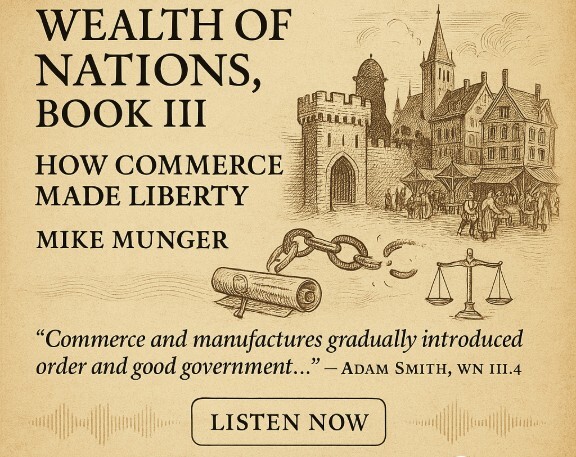 Well, by the close of the chapter, Smith has painted a vivid picture. Commerce ended feudalism. Markets encouraged agriculture, merchant wealth reinvigorated land, and the rise of burgs undermined the arbitrary power of feudal lords. The changes came not through violence or decree, but by, in Smith's terms, the silent and insensible operation of foreign commerce and manufactures. In short, towns did not drain the countryside, but helped liberate and improve it. Through markets, investment, and governance, they transformed the very structure of European society. The next episode, part seven, will be released on Tuesday, November 25, where we will take up Book 4, where Smith develops his comparative systems view of economics. Talk to you then.