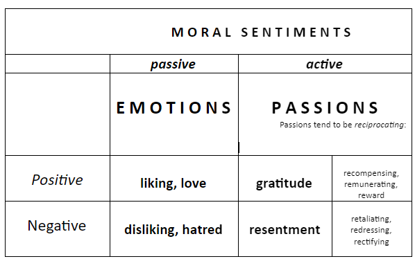An active sentiment, or passion, is one that motivates. Mary feels a passion if she regards Jim’s conduct and the resultant moral sentiments motivates her toward some action. The action might be other-directed, but that “other” might be someone other than Jim: For example, it might be Jim’s benefactor or Jim’s tormenter. The other-directed passions most central to Smith's analysis are gratitude and resentment. Gratitude is a positive passion, motivating recompense. Resentment is a negative passion, motivating punishment or retaliation.
