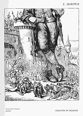 ...commanded his general to draw up the troops in close order, and march them under me; the foot by twenty-four abreast, and the horse by sixteen, with drums beating, colours flying, and pikes advanced. This body consisted of three thousand foot and a thousand horse. His majesty gave orders, upon pain of death, that every soldier in his march should observe the strictest decency with regard to my person; which however could not prevent some of the younger officers from turning up their eyes as they passed under me: and to confess the truth, my breeches were at that time in so ill a condition, that they afforded some opportunities for laughter and admiration. (Ch. 1)