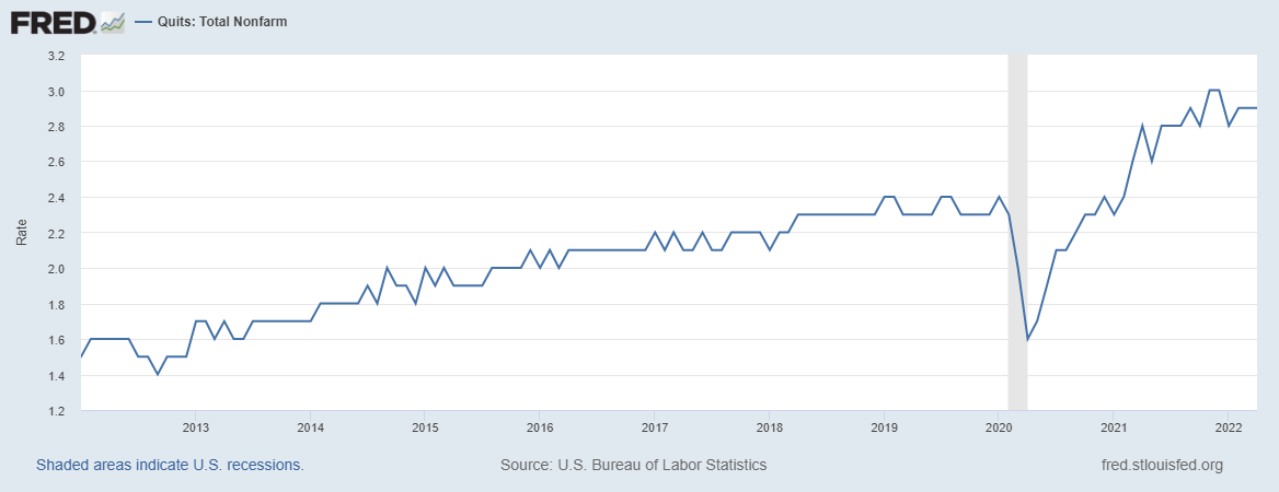 The Bureau of Labor Statistics (BLS) keeps data on quits rates to distinguish worker movement from employees who are fired or laid off. In 2019, before large effects of the pandemic were in the US, quit rates were about 2.3 or 2.4 percent. In March of 2020, it dips to 2 percent, April is the low of 1.6 percent, then it starts rising and, within a year, surpasses the previous averages by a lot.