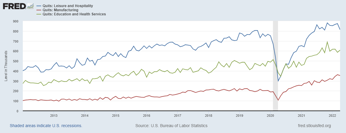 Between 2019 and 2021, the total annual quits rate increased from 28% to 32.7% - an almost 5-point difference! And the early data from this year (January-April) looks like the quits rates are staying high. The quits rate in February of 2020 (pre-major pandemic effects) was 2.3 percent, about 3.4 million people in a month. In the BLS preliminary data from April it’s 2.9 percent. That’s about 4.4 million people in a month. From October 2021, when the quits rate returned to the pre-pandemic level of 2.3 percent, until last month, there have been about 94,128,000 quits. That is a lot of labor market shuffling! While there is no easy way to know where quitting workers went (a worker who quits to another job and a worker who quits and leaves the labor market are counted the same in this data set), we do know some things about which industries are experiencing lot of quits and if you’ve been to a fast-food restaurant and waited twice as long for an order with twice as many mistakes as you used to get, you won’t be surprised.
