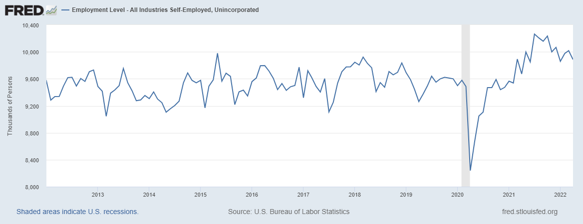 Source: Employment Level - All Industries Self-Employed, Unincorporated | FRED | St. Louis Fed (stlouisfed.org)