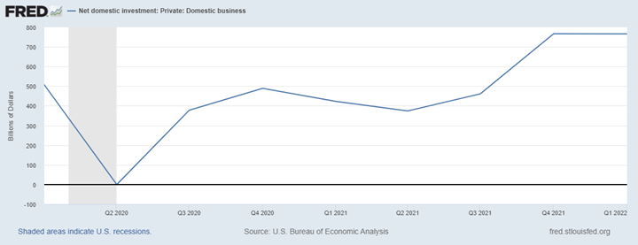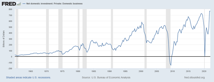But if the savings aren’t eaten up by government debt, we can look forward to higher rates of long-term growth in the future. The more the corporate sector absorbs savings and turns them into investments, the more confident we can be that these savings will lead to higher rates of long-term growth. Let's look at what is happened with business investment next:
