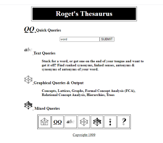 Dr. Old: The website was created as a resource for research on Roget’s thesaurus and the semantics of the English language. A text file from the Project Gutenberg: Free eBooks web site, was converted to a database. The database, html files, and Roget’s web site were aimed at making a free, digital, open source version of the 1911 Roget’s Thesaurus available to any researcher who was interested. It was inspired by the research work of Professors Walter A. Sedelow Jr. and Sally Yeates Sedelow on whole-language semantic space.