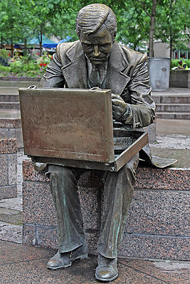 At other times, his generalizations look over-broad because for us the boundaries of art have moved. For example, he claims that statues should be without “drapery.” How would he evaluate our ready acceptance of decidedly non-nude, realistically dressed public statuary? He also insists that a statue, unlike a painting, must represent something noble and should certainly not represent anything ordinary or “mean.” That opinion would rule out statues like New York City’s much-loved “Double Check,” the life-size bronze of a man in a suit, seated and checking the contents of his briefcase.