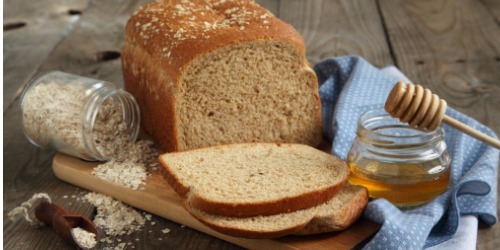 6. Preheat the oven to 375F. Punch down the dough and shape into a rectangular loaf. Place in a buttered loaf pan. Cover loosely and let rise again until doubled in size or rising over the top of the pan. Melt the remaining tablespoon of butter and honey together, then brush the top of the loaf. Garnish with the extra oats scattered on top.