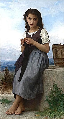 As any knitter or spinner can tell you, this is work that can be picked up and put down at will. (I am, in fact, picking up and putting down my own knitting as inspiration for this post ebbs and flows.) Knitting, in particular sock knitting, travels well, and could be bundled into an apron pocket at a moment’s notice if the landlord required one’s services. And experienced and well-coordinated knitters could even work on a stocking while walking to or from the field or kitchen where their “real job” took place.